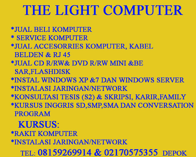 THE LIGHT COMPUTER *Service dan Jual Beli Komputer *Jual Aneka Cooler Pad (pendingin untuk laptop) big; 3 fan , Aneka HEADSET Keenion dll, diskette, flash disk, mouse, keyboard, *Melayani MAINTENANCE komputer dan Instalasi Network/LAN *Up Grade dan Rakit Komputer, Kursus Rakit Komputer dan Instalasi LAN HUB: 0815-818-835-8